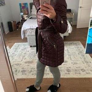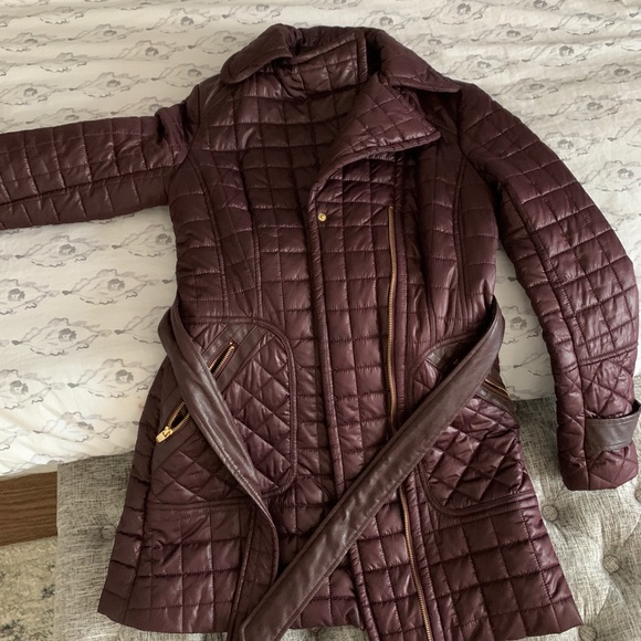 Hardly worn like new, maroon coat with leather accents. Good zippers, tie for more fitting look!