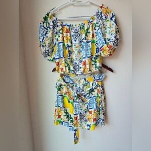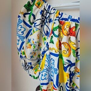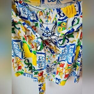 VIANOVA ITALY Majolica LINEN SET Cropped Ruched Top Wrap Mini Skirt Size L M
