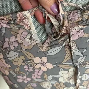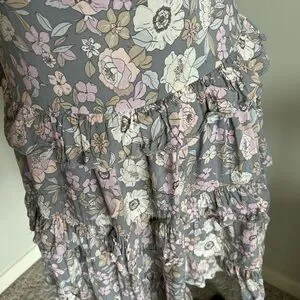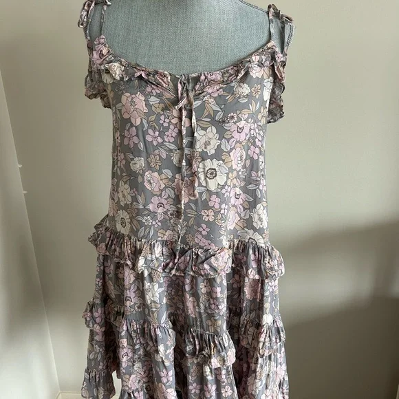 Elegant floral dress with ruffle accents. Features gray and pink tones. Adjustable tie in front & adjustable tie shoulder straps
