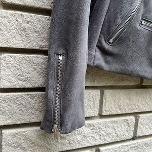 Timeless biker inspired jacket in faux suede finish. Grey with silver zippers. Asymmetrical front zip. All featured front zippers are actually pockets with 2 zippers at arm cuffs. Has spandex in it so will create a fitted look. Cropped length.