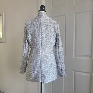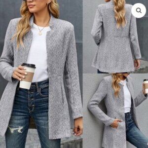 Work to weekend style never looked so good! This coat will instantly elevate your office wardrobe with a heather grey and white herringbone, wool-like base. Designed with a standing notched collar, long sleeves and an open front. Finished with a full lining and front slit pockets.