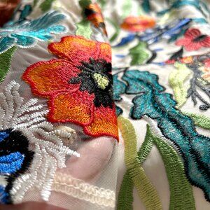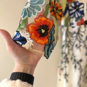Timeless elegance meets vintage charm in this beautiful cream dress. Featuring intricate floral embroidery in a garden-inspired pattern, it’s designed from airy mesh fabric with sheer sleeves adorned in delicate blooms. The frilled silhouette adds a regal touch, making it a standout piece for special occasions or classic vintage styling. Never worn.