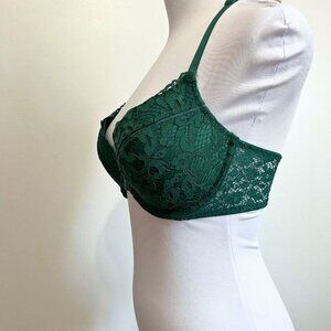 VICTORIA'S SECRET FOREST GREEN VERY SEXY PUSH-UP PIGEONNANT RACERBACK LACE BRA - 32D, This is a sexy forest green push-up pigeonnant sheer lace racerback bra with a front closure - underwired - spaghetti adjustable straps - fall and winter colour palette. Sexy, sensual , valentine's day special intimate night favorite.