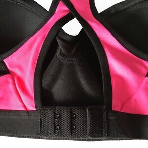 VICTORIA'S SECRET Incredible Sports Bra. Workout in comfort flaunting bright neon pink and black colour blocking design. Features maximum support, V-neckline, pull-on style, breathable padding with wicking liner, concealed underwire, adjustable straps, racerback and hook closure details. Pairs well with Victoria's Secret Knockout Crop Pant, also available as a separate item in my closet.