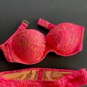 VICTORIA’S SECRET LACY BIKINI SET 32C Top, Small Cheekini Bottom CORAL PINK