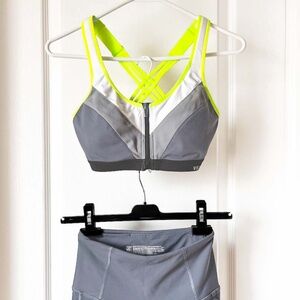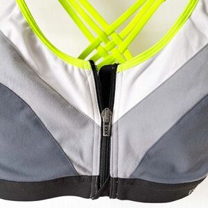 VICTORIA'S SECRET VSX The Knockout Front Close Sports Bra. Flaunting a bright neon yellow green trim and grey chevron-esque striped colour block design in sexy VS style. Features a double layer front closure for a secure fit, maximum support, adjustable straps and soft elastic band details. Ready for a workout - click, zip and go!