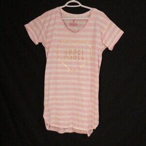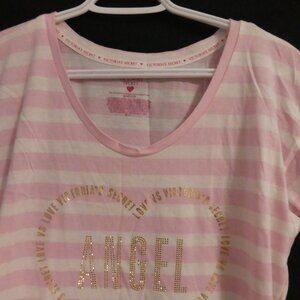 Cute striped slip on sleep shirt with a bold gold "Angel" print and "Love Victoria's Secret" print heart pattern design on the front