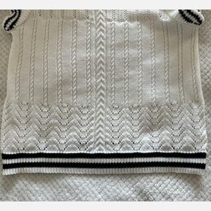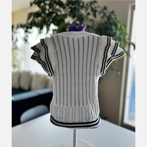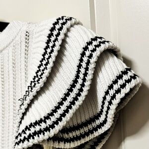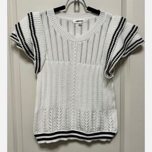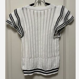 This Vigoss short-sleeve sweater features a beautifully textured open pattern, soft flutter sleeves, and clean black stripe detailing for a modern, slightly preppy look. The knit has a comfortable, medium-weight feel—structured enough to hold its shape but still easy to wear.