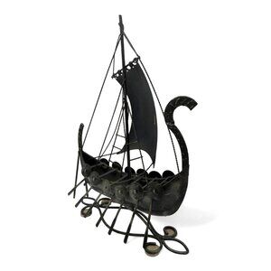 This vintage metal Viking ship sculpture captures the essence of seafaring history, showcasing intricate craftsmanship with its detailed oars and sail design.