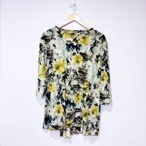 This beautiful floral wrap top by Vin Rouge combines comfort and elegance in a soft stretch jersey. The flattering wrap silhouette features a wooden button accent and shades of green and yellow for a nature-inspired look. Perfect for both casual wear and office chic.