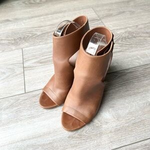 VINCE Addie Open Toe Buckle Back Strap Brown Leather Bootie Wooden block Heel