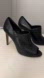 Vince Camuto black leather peep-toe booties in excellent pre-owned condition. Worn only a couple of times with minimal sole wear and clean, smooth leather. Features a sleek cut, slim stiletto heel, and comfortable cushioned footbed. A versatile, timeless style that works for both casual and dressy outfits. Retails around $140
