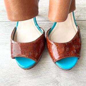 Contemporary open toe style with wide elastic gored vamp, back zip closure and a decadent covered heel