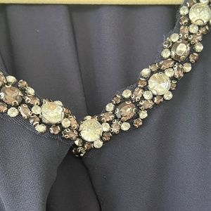 Beautiful chiffon Vince CAMUTO navy dress w/ gorgeous jewel neck detail….. shawl style capelet arms. Perfect for a fall wedding or sophisticated evening event