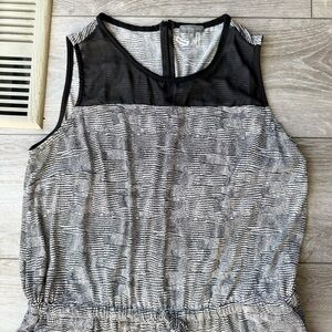 Stylish jumpsuit with black mesh yoke, elastic waistband with drawstring, pockets and zip back closure.