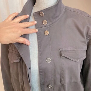 Buttoned jacket with drawstring. 4 front pockets with silver buttons. The Colour is like a washed-out grey/blue. Excellent Condition.