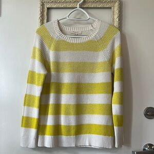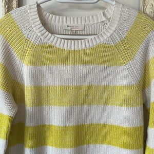 This light weight knit sweater showcases a vibrant yellow and white stripe pattern, perfect for adding a pop of color to your casual wardrobe. The crew neck design with ribbed trim offers a classic look, while the lightweight knit ensures comfort and versatility for everyday wear.