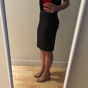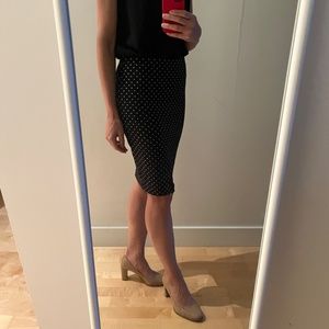 Black skirt with white polka dots, with a good amount of elastane (would fit XS and S) - for reference, I am XS.