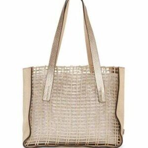 A contemporary interpretation of a basket bag, this peek-a-boo netted tote is designed with a structured shape in metallic leather.