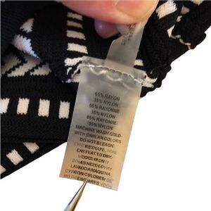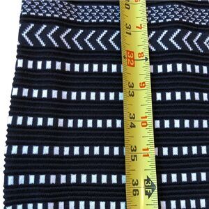This is such an eye catching dress! Black & White pattern, stretchy, fitted, fun. Size small, see measurements. In excellent pre-owned condition, like new.