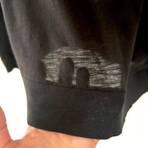 A lightweight, black, long-sleeved top with a relaxed, slightly loose fit. Drop shoulder. Casual, rounded scoop neck with edging. Cuffed sleeves and hemline, slightly sheer with textured appearance.