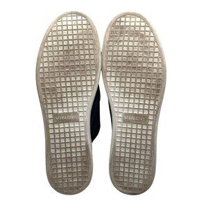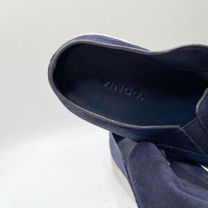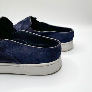 VINCE. WOMEN'S BLAIR NAVY SUEDE SLIP ON LOAFERS, this is a unisex yet women's navy suede slip on loafers in a contrast white rubble outsole and navy suede upper - slip on style with an interseting low back heel to ease the process - very comfy yet sleek and chic - perfect transition shoes from summer to fall with a cropped jeans or a dress pants.