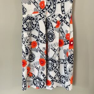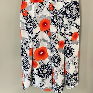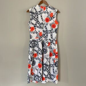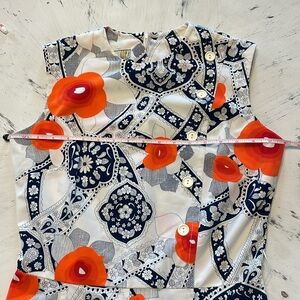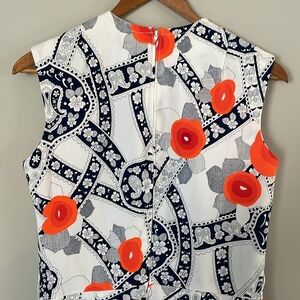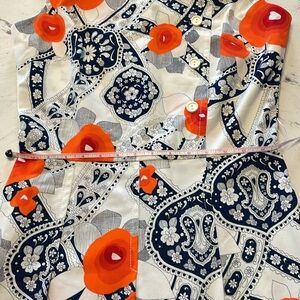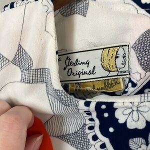 VINTAGE 1960s Sterling Original Dress. Vintage size 13/14. White and navy blue pattern with vibrant orange flowers. White buttons down the left side of the bodice. Box pleats in the skirt. The bottom needs to be hemmed. There are belt loops at the sides but no belt. Zipper at the back that moves up and down easily. This dress is in excellent condition with crisp colours. There is no fabric type label but I would guess a cotton/polyester blend, I would not consider it stretch fabric but it does have give. Measurements are included below.