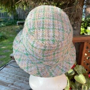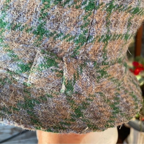 Vintage plaid 1960 100% wool hat. It is like a hybrid between a cloche and a bucket hat. It’s 21 inches circumference measured inside the hat. Plaid is grey, blue green and tan wool and is embellished by a small flat bow on the left side. Inside is orange and not sure what the fabric is although it is satiny.