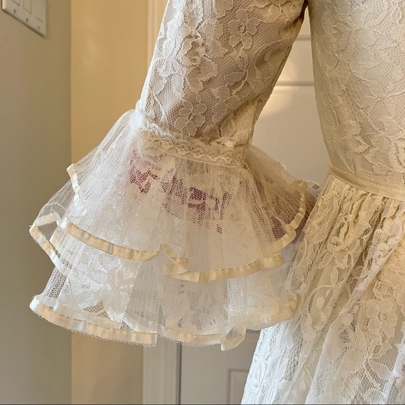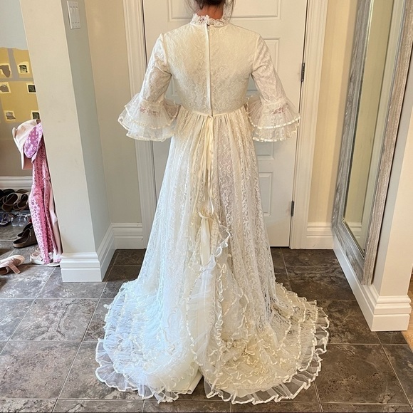 VINTAGE 1970s Raimbow Floral White Lace Ruffle Bell Sleeve & Train Wedding Dress