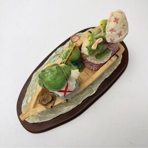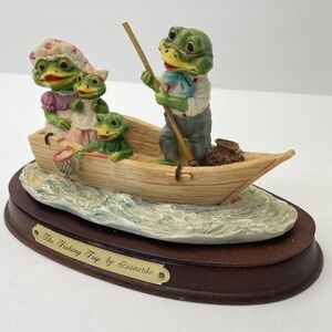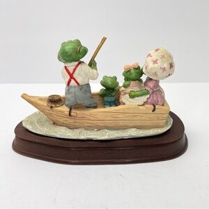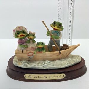 The Leonardo Collection The Fishing Trip Figurine family of frog fishing in a row boat. The ornament is vintage and in great condition no issues. Made from resin on a wooden base.