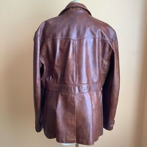 Vintage 70's rich brown genuine leather blazer jacket with outstanding features. Substantial weight leather, relaxed boxy fit. Four functional patch pockets, single back vent. Crafted from quality leather, this coat ensures durability and timeless appeal.