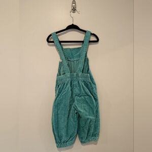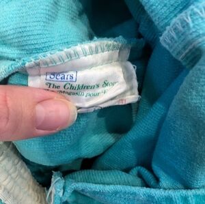 Vintage 70s teal velour overalls with ruffle detail and button closures. No snaps for diaper changes. No size tag but measurements are comparable to 12M. Excellent used condition, no rips or stains. Originally from Sears.