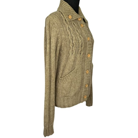 Vintage 70s-early 80s cable knit button-up cardigan by Spanner. Button-up high collar. 2 side pockets. Peanut brown color. Missing contents tag. Feels like 100% wool. Similar are 100% pure virgin wool. Made in Hong Kong. Listed as a size L. Best fit size S-M based on measurements.