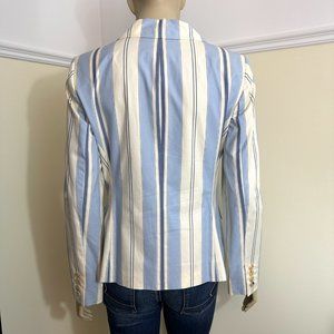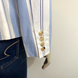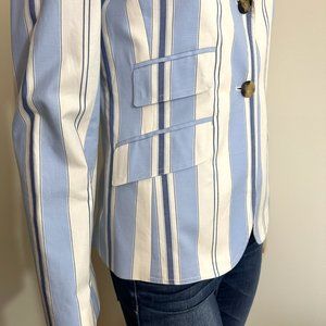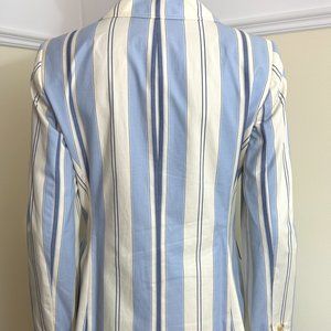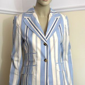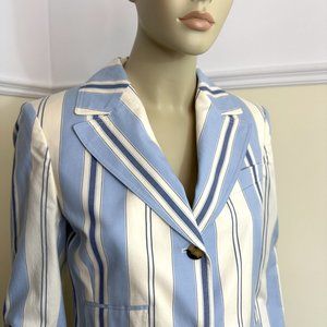 VINTAGE 90's ANNE KLEIN New York NWOT - I bought this elegant jacket from Holt Renfrew - made in Turkey Blue Ivory Striped Jacket Fitted 100% Cotton, Lined 100% acetate, collared neckline, 2 buttons hook & eye closure, 4 pockets (back pockets are still sewn shut). It's still in beautiful condition.