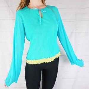 🍓ABOUT: 90s Vintage Blue and green Layered Fairycore semi-sheer long sleeve top with flared sleeves and lettuce cut hem. Beautiful blue and bright green shirt with tie up neck line design.