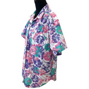 Vintage 90s short sleeve floral buttoned blouse by Perspective. Notched collar. Single open chest pocket. Colors are white, amethyst purple, punch pink, and seafoam green. 100% cotton. Made in Vietnam. Listed as a size M.