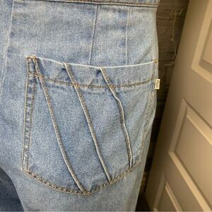 In very good condition. Well made thin denim almost chambray. Light med wash. 100% cotton. Hi rise wide cropped leg slightly tapered with a small slit. Great simple and trendy jeans. Side button and zipper closure. 2 back pocket. Please see pictures