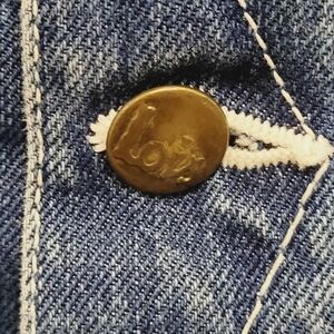 Vintage denim jacket in medium blue with white contrast stitching.