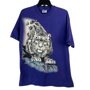 VINTAGE 90s Men’s Single Stitch Snow Leopard Graphic T-Shirt Indigo Blue Crew L