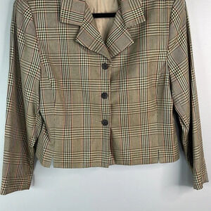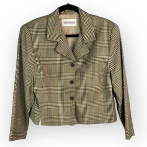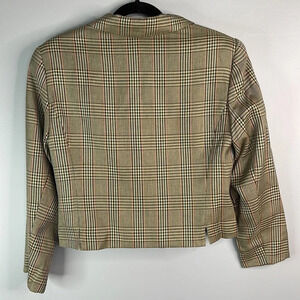 Ladies tan Vintage 90’s Collections Internationale Houndstooth Plaid Structured Crop Blazer jacket.