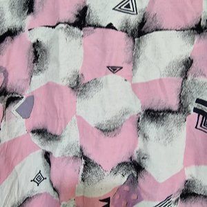 90's blouse with an amazing graphic pattern! a beautiful shade of light pink, with white, gray, and black pattern. fabric is lightweight and flowy, making it a perfect summer shirt. would fit women XL and men L, but can be worn as an oversized shirt as well. measurments: