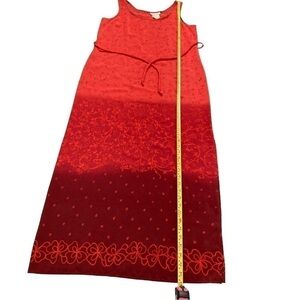 Great style for summer and great for layering in the fall! Maxi length at 55” approximately. Side slit on one side starts at about 35” from the shoulder seam. Ties at the waist to give more shape. Vintage size 13, fits like a large or possible extra large. Bust measures about 40”. Ombré printed pattern from floral to polka dots to paisley lace brocade