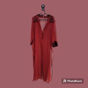 beautiful sheer vintage cover-up! maxi length, flowy, and shiny. the fabric is slightly iridescent and very unique! sleeves are elbow length. in perfect condition! will fit a size L-XL