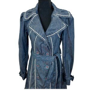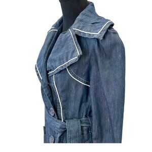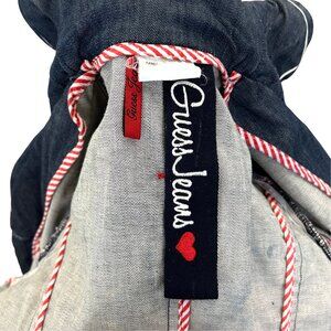 Vintage 90s-Y2K denim trench coat jacket by Guess. Extended notched lapel collar. Has a waist belt. Candy red and white piping trim along the collar and front. Denim covered buttons. Belted puff sleeves. Side pockets. Dark blue wash. 98% cotton, 2% elastane. Made in Tunisia. Listed as a size S.