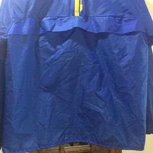 Vintage Anorak Unisex Windbreaker, Lightweight Packable Hoodie Jacket, Size S, Color Blue, 100% Nylon, Drawstring Waist, Front Zipper Pocket, Closure Pullover Half Yellow Zipper, See Small Thread Lose on Zipper but it is in Good Condition, Great Jacket, Great Look, Great Fitting.