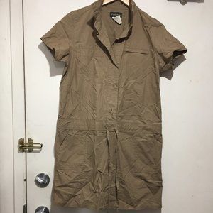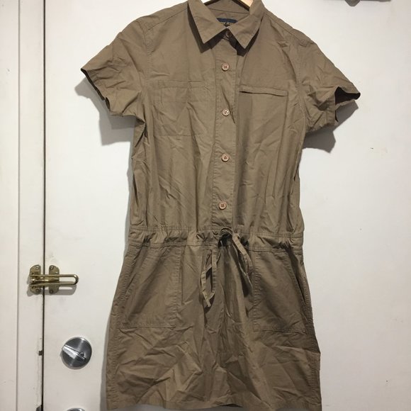 Armor Jeans Dress, Lightweight Size L, Color Tan, 100% Cotton, Side Pockets, Back Pockets, Breast Pockets, Drawstring Waist, Closure Buttons Pullover, Front Small Spots but in Good Condition, Great Dress, Great Look, Great Fitting.