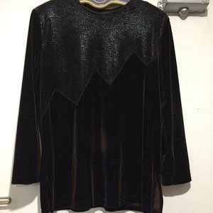 Artex Collection Blouse Set, Missing Fabric Label, Brown Velvet, Shoulder Pads, Front Cut Stitching Pattern, Closure Crewneck Pullover, Button Down, Elbows Color Faded, Missing Button but in Good Condition, Soft Silky, Great Look, Great Fitting.