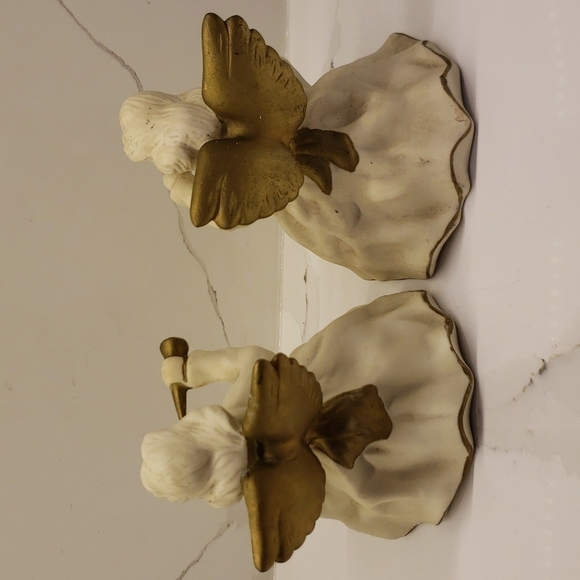 This set of 2 angel figurines are in fair vintage condition with some wear. Both angels have marks/stains throughout but the angel with the face down has more staining and trumpet is broken. See photos.