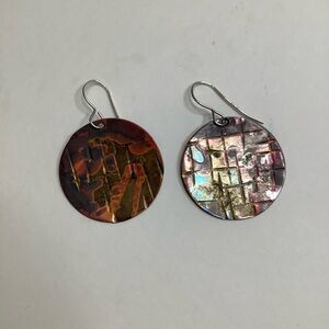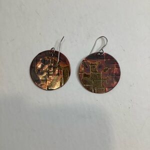 These earrings showcase a captivating molten pattern in copper, crafted with a unique patina process. Lightweight and hanging from silver wire hooks, they offer both style and comfort.