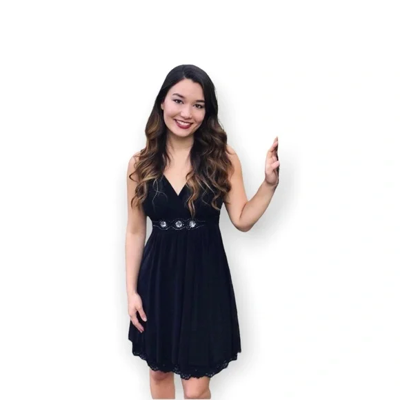 Gorgeous baby doll dress with unique Y2K features including jewelled section under the bust and lacy underpiece peaking out from the bottom with sparkly purple butterflies. Subtle but stunning. You could easily dress this piece up or down!